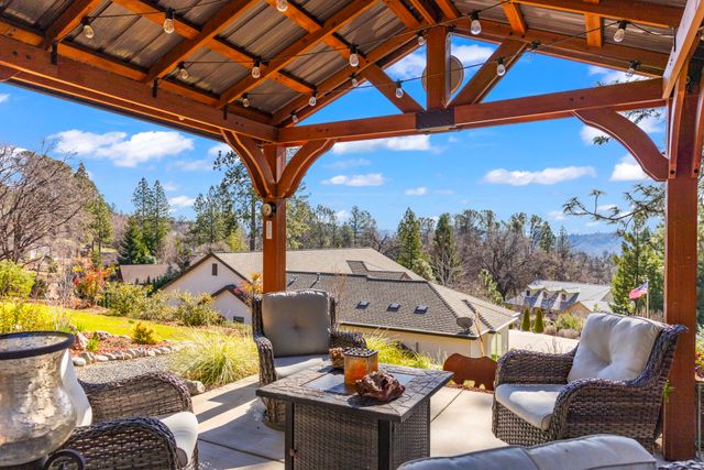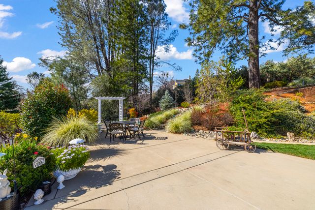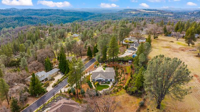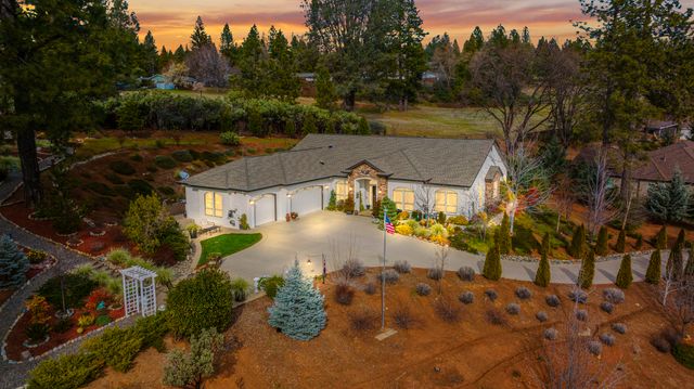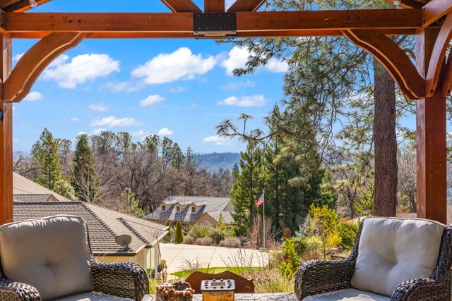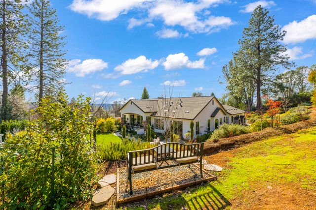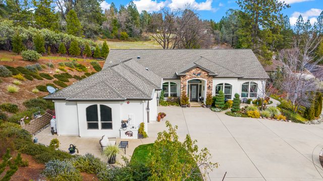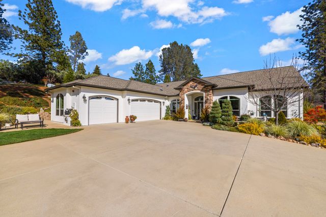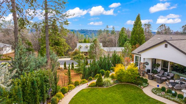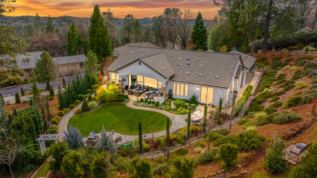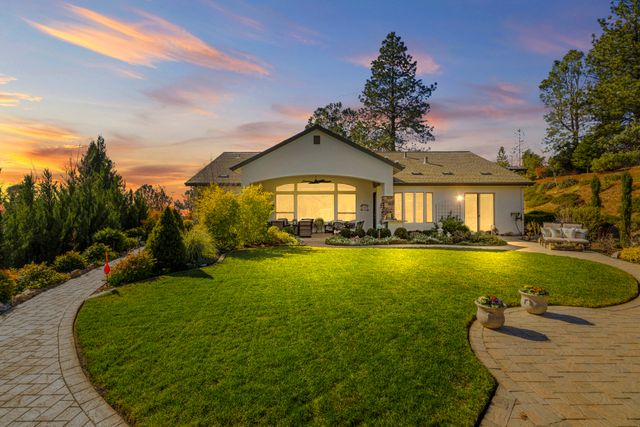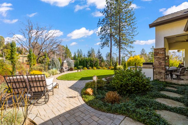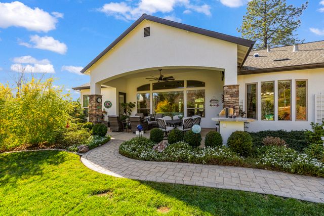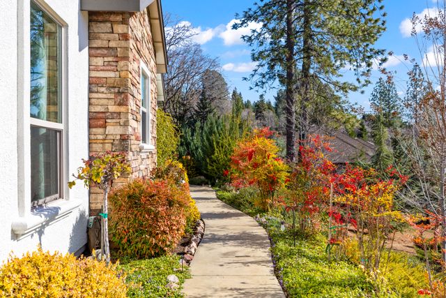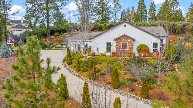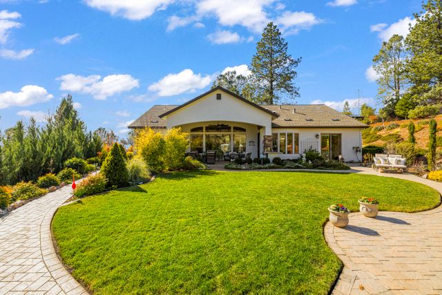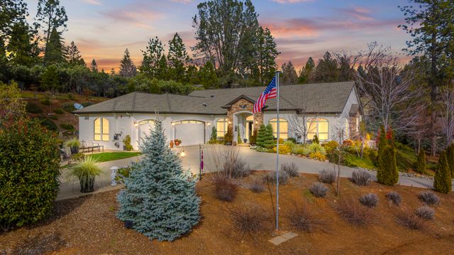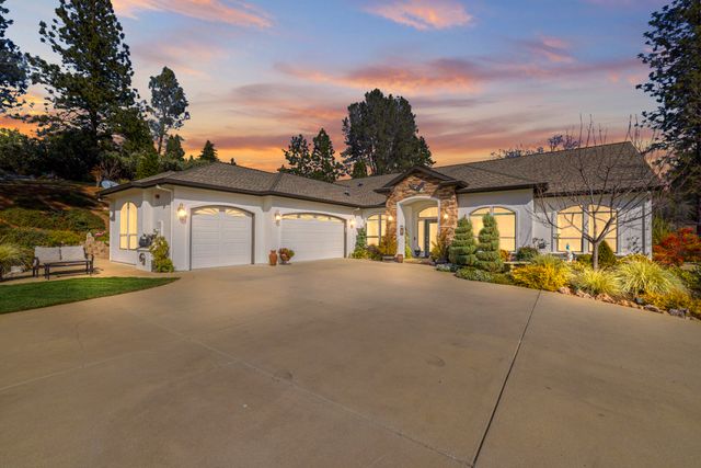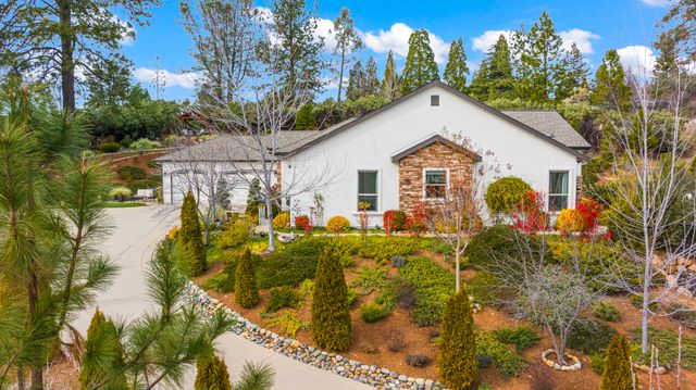 Nestled on a private road among newer custom homes, this meticulously maintained single-story residence exudes pride of ownership. Built in 2015, the home sits on over an acre of lush, fully irrigated gardens with vibrant flower beds and custom all-season landscaping, offering breathtaking sunset and canyon views and a serene backdrop of the community-owned open land. Inside, high ceilings, solar tubes, and expansive windows fill the home with natural light, while tray ceilings, crown molding, and hand-scraped hardwood floors add timeless elegance. A popular floor plan showcases a stunning stone fireplace, upgraded fixtures, and an inviting open layout perfect for entertaining. The spacious primary ensuite is a true retreat, featuring a luxurious bath, walk-in closet, and serene garden views. Outside, a covered entertainer's patio provides the perfect space for year-round gatherings, complemented by a second stone fireplace and romantic gazebo for cozy evenings. The oversized three-car garage, complete with custom cabinetry, adds convenience, and the home is generator-ready for peace of mind. Located in popular Camino neighborhood in the Apple Hill area with access to the El Dorado Trail, this quiet retreat on a premium lot seamlessly blends style, comfort, and natural beauty.