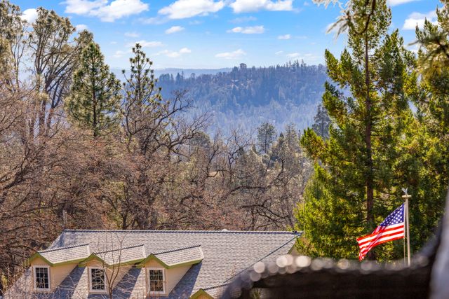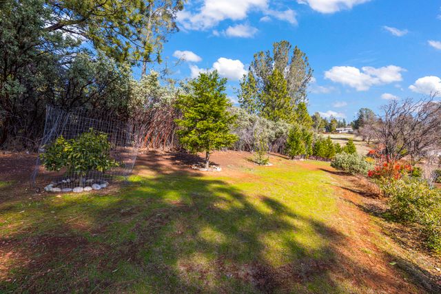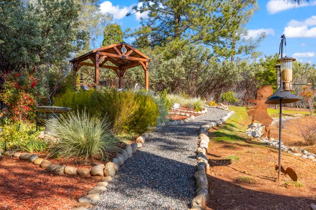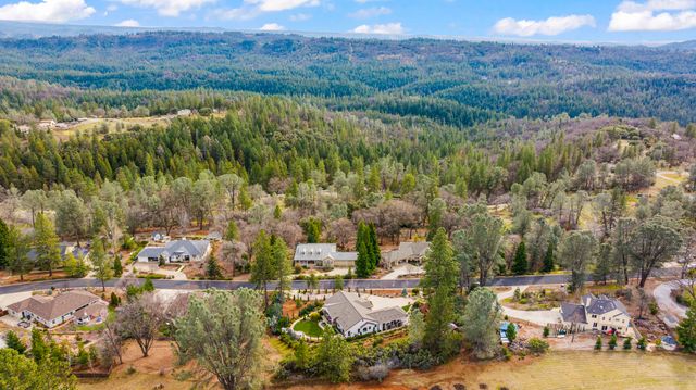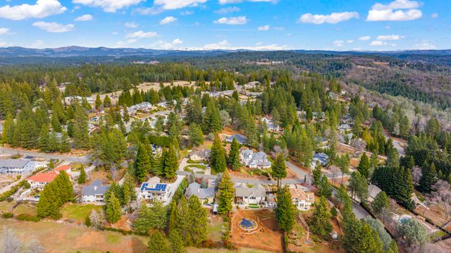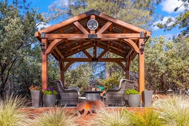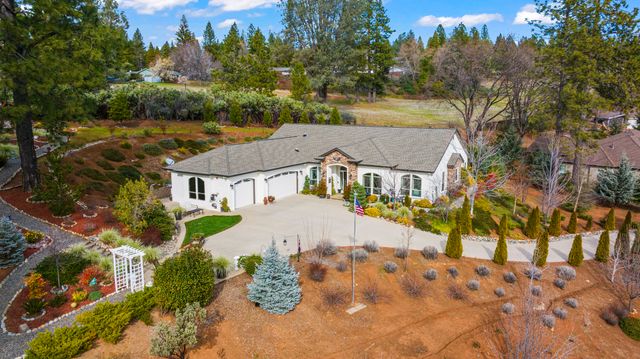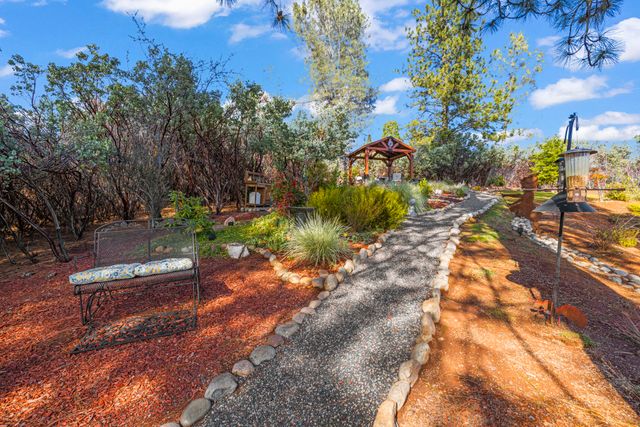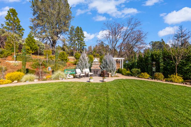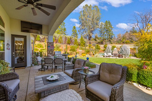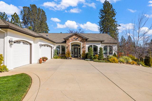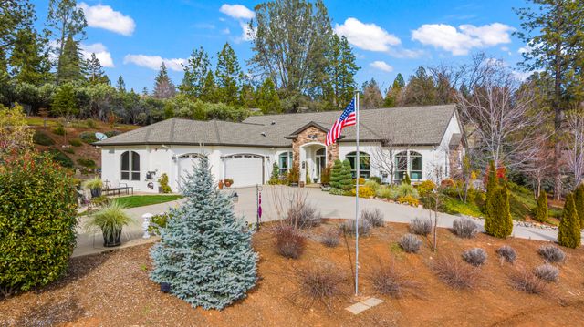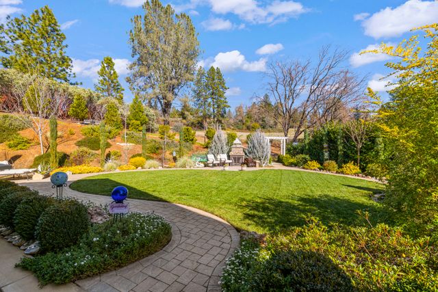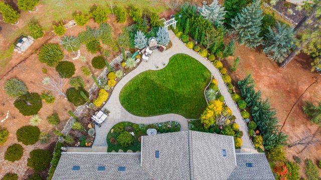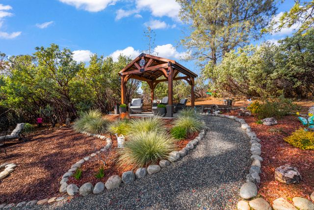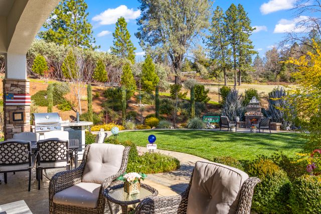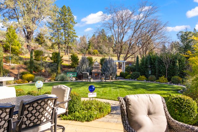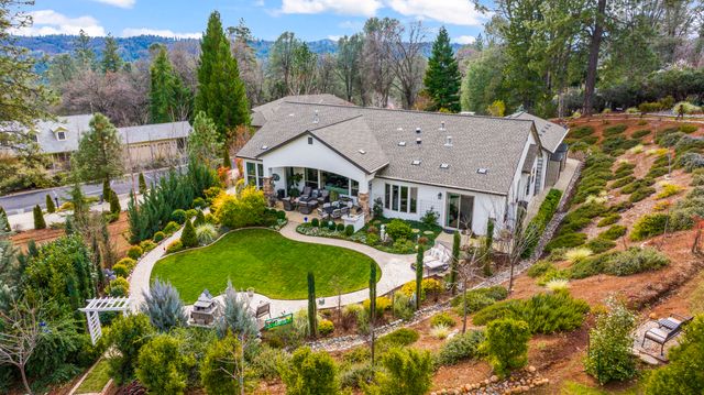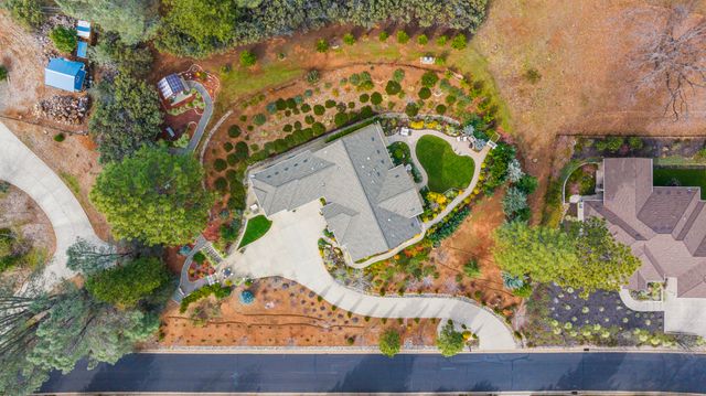 Nestled on a private road among newer custom homes, this meticulously maintained single-story residence exudes pride of ownership. Built in 2015, the home sits on over an acre of lush, fully irrigated gardens with vibrant flower beds and custom all-season landscaping, offering breathtaking sunset and canyon views and a serene backdrop of the community-owned open land. Inside, high ceilings, solar tubes, and expansive windows fill the home with natural light, while tray ceilings, crown molding, and hand-scraped hardwood floors add timeless elegance. A popular floor plan showcases a stunning stone fireplace, upgraded fixtures, and an inviting open layout perfect for entertaining. The spacious primary ensuite is a true retreat, featuring a luxurious bath, walk-in closet, and serene garden views. Outside, a covered entertainer's patio provides the perfect space for year-round gatherings, complemented by a second stone fireplace and romantic gazebo for cozy evenings. The oversized three-car garage, complete with custom cabinetry, adds convenience, and the home is generator-ready for peace of mind. Located in popular Camino neighborhood in the Apple Hill area with access to the El Dorado Trail, this quiet retreat on a premium lot seamlessly blends style, comfort, and natural beauty.