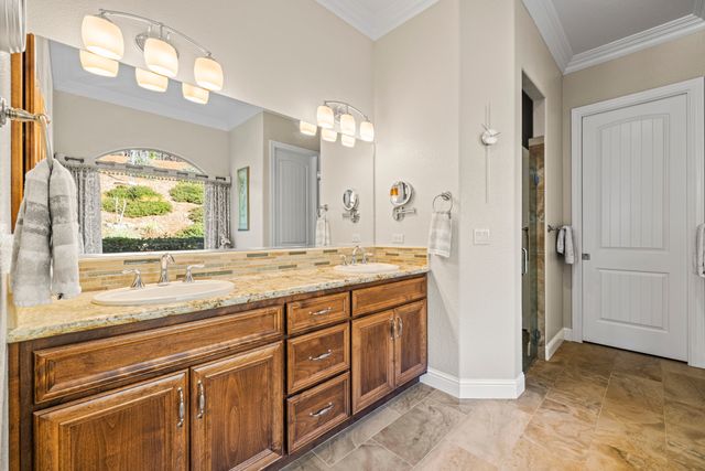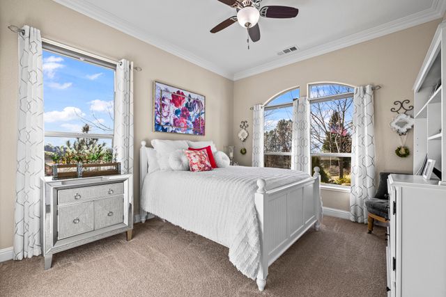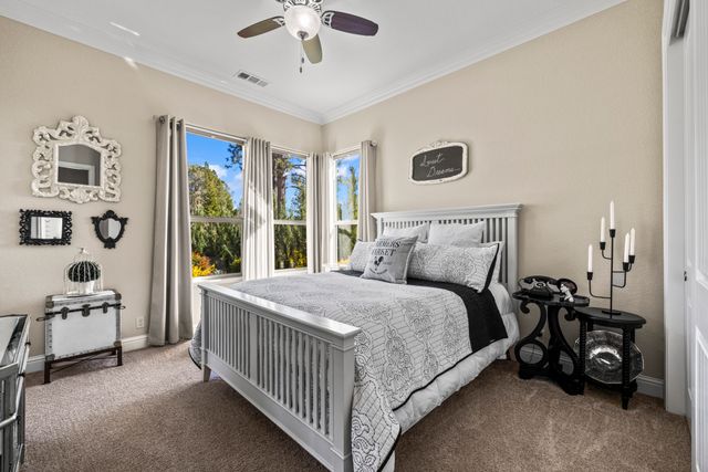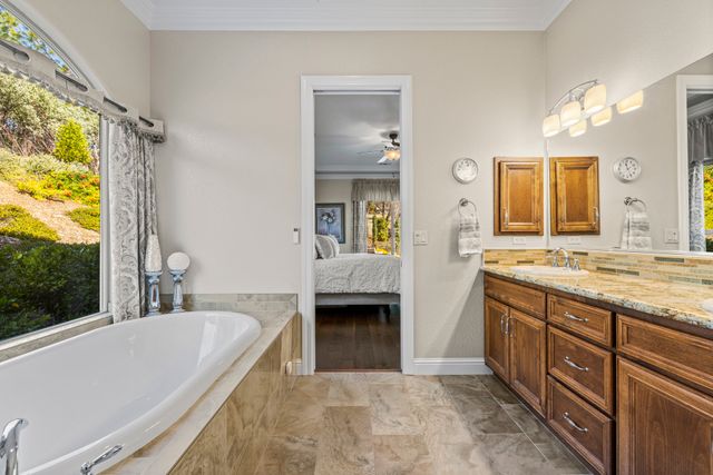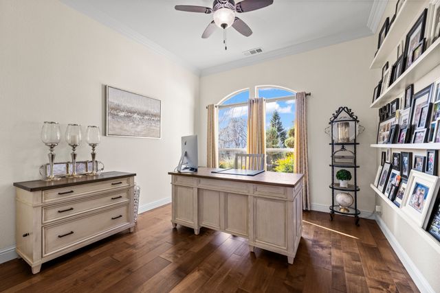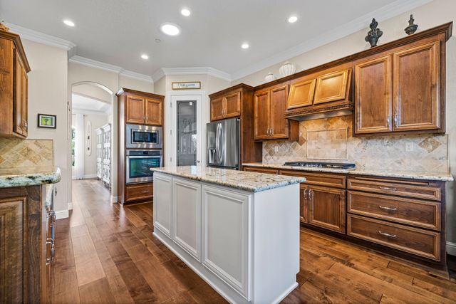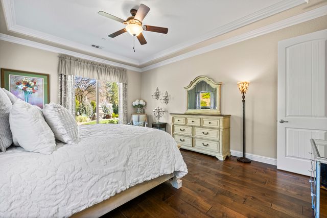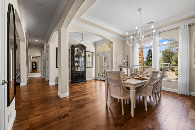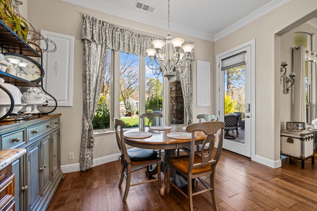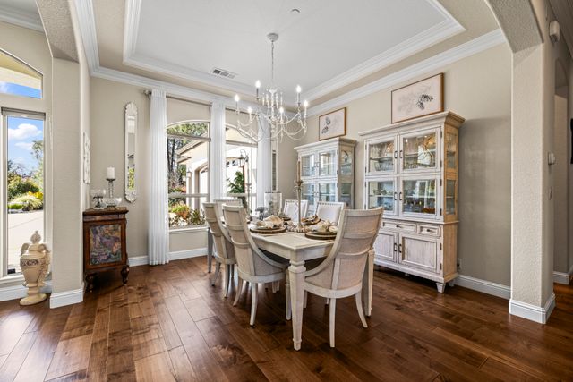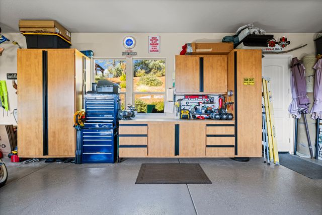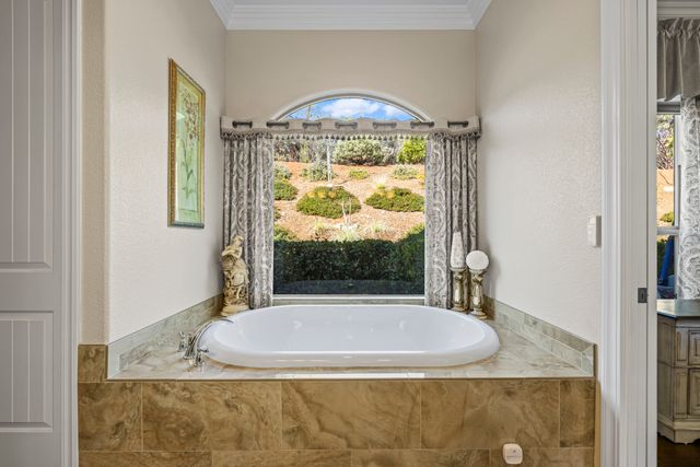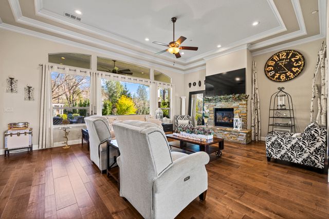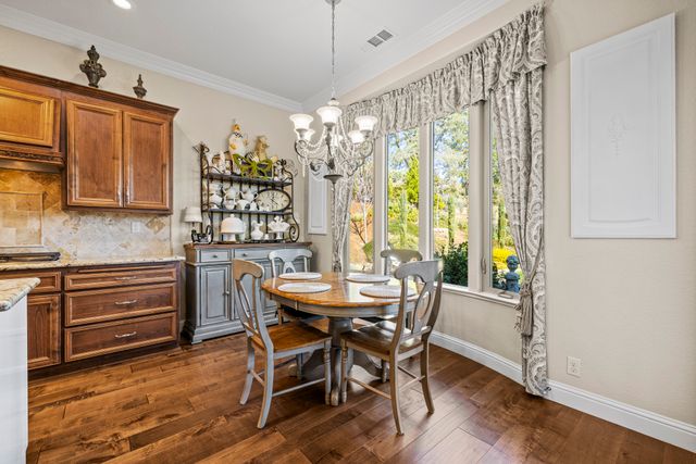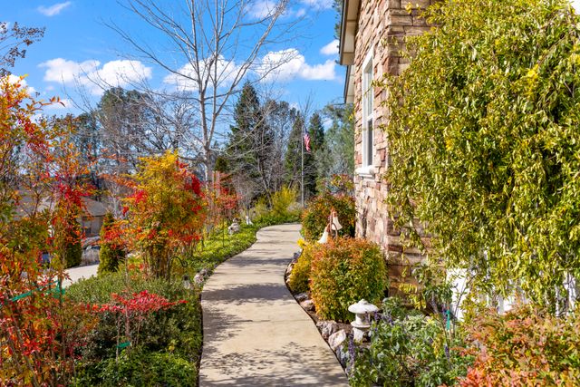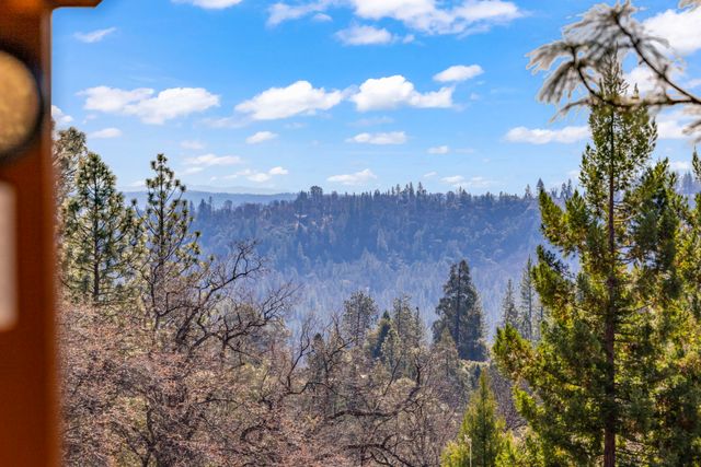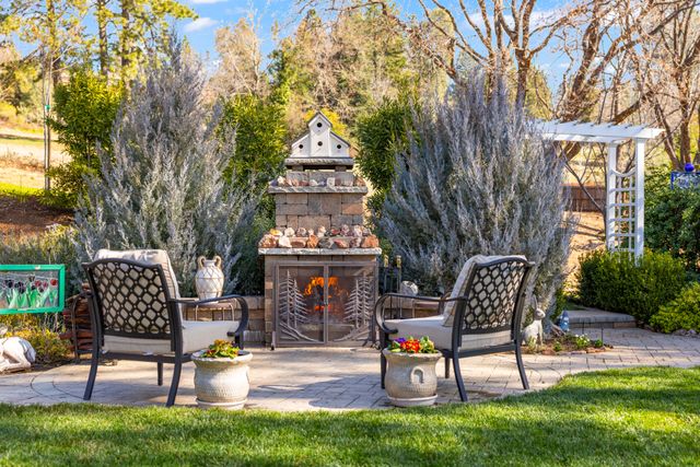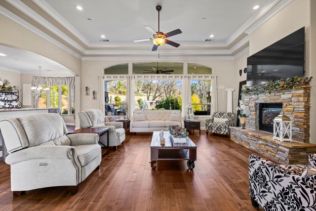 Nestled on a private road among newer custom homes, this meticulously maintained single-story residence exudes pride of ownership. Built in 2015, the home sits on over an acre of lush, fully irrigated gardens with vibrant flower beds and custom all-season landscaping, offering breathtaking sunset and canyon views and a serene backdrop of the community-owned open land. Inside, high ceilings, solar tubes, and expansive windows fill the home with natural light, while tray ceilings, crown molding, and hand-scraped hardwood floors add timeless elegance. A popular floor plan showcases a stunning stone fireplace, upgraded fixtures, and an inviting open layout perfect for entertaining. The spacious primary ensuite is a true retreat, featuring a luxurious bath, walk-in closet, and serene garden views. Outside, a covered entertainer's patio provides the perfect space for year-round gatherings, complemented by a second stone fireplace and romantic gazebo for cozy evenings. The oversized three-car garage, complete with custom cabinetry, adds convenience, and the home is generator-ready for peace of mind. Located in popular Camino neighborhood in the Apple Hill area with access to the El Dorado Trail, this quiet retreat on a premium lot seamlessly blends style, comfort, and natural beauty.